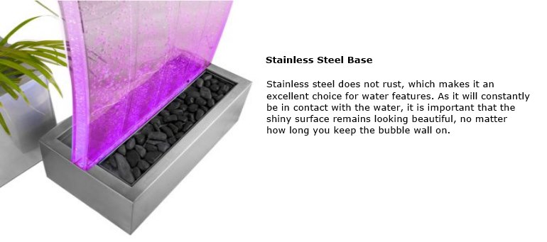 This striking modern beautiful curved Bubble Wall water feature with brushed stainless steel frame will look great in any modern setting. Bubbles lit by LED lights continuously rise from the base of the feature up through the water contained in the acrylic walls creating a effect that illuminates the dark. The LED lights in this feature can change to a wide range of and a remote control enables you to change the look of the water feature whenever you like. Bubble Walls can also be used to provide privacy by creating partitions. This water wall is bound to bring excitement and brightness to your home. There's nothing better than a bubble wall.
